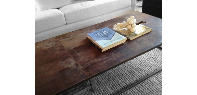 Koffietafel met blad van onbehandeld leer (kan natuurlijk ook in hout of hardsteen)Prijs vanaf 1 vierkante meter: Euro 1600,--